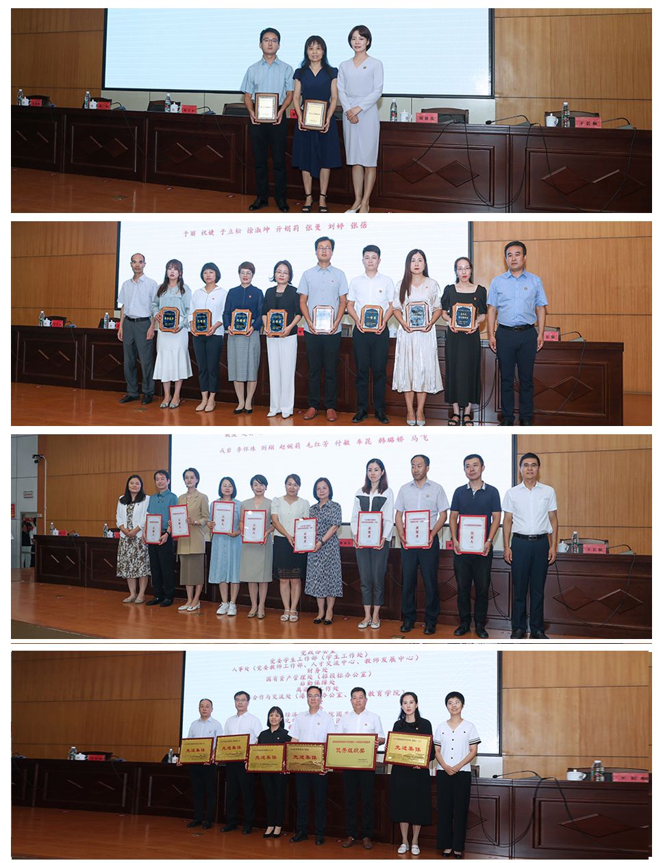 会上表彰了2022-2023学年度获得厅局级以上教学、科研奖励以及荣誉称号的集体和教师,为2022年校园优秀新媒体平台、校级黄大年式教师团队颁发了奖牌,为从事教育教学工作满三十年的教职工颁发了纪念证书,并对2022年度考核优秀单位进行了表彰。