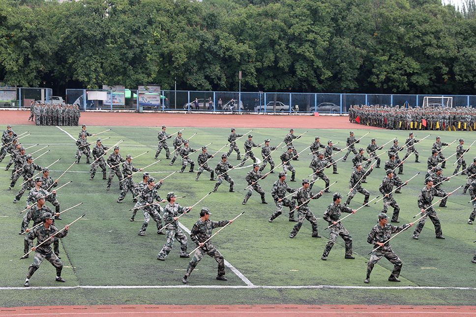 战术方队的80名同学组成了军训场上一把坚韧有力的“尖刀”。在作战指挥员的指令下,同学们防守与进攻协调配合,战术与技巧合二为一,动作整齐划一,招式轻快干练,充分展示出他们顽强拼搏、永不言败的精神气概。