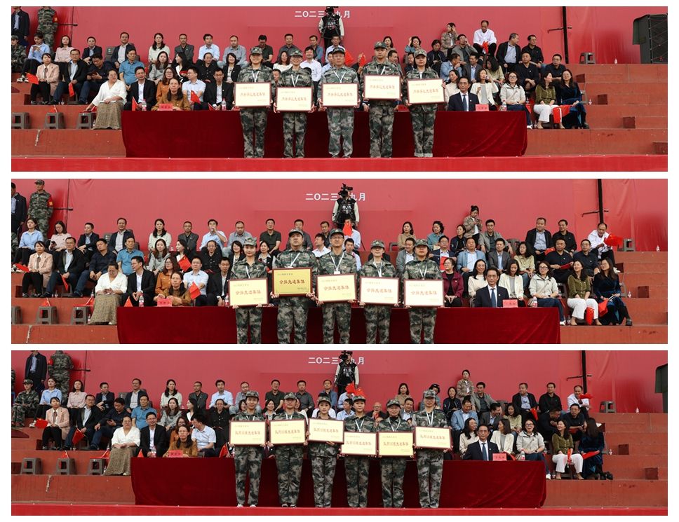 军事技能训练成果展后,副校长毛龙灿宣读了beat365正版唯一官网必一《关于表彰2023级新生军训先进集体和先进个人的决定》。领导们为获奖的先进集体和个人代表颁奖。