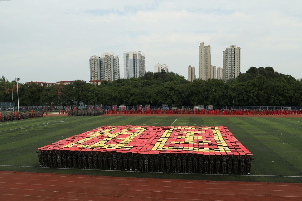 花样方队的1200名同学们手持红黄双色纸板,通过颜色和动作变化,变化出中国、国旗、党徽以及校徽等不同的字样和图形,充分展示了他们爱国、爱党、爱校意识。