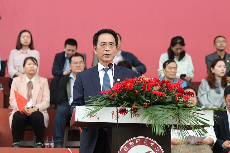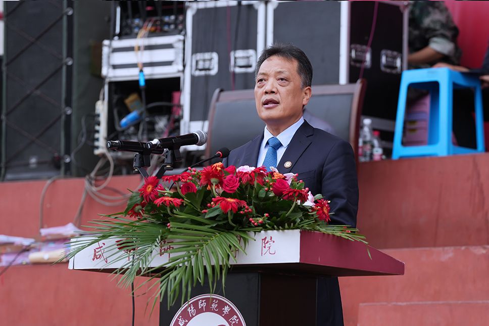 校领导为新生代表佩戴校徽,欢迎同学们成为咸师大家庭的一员。全体同学庄严宣誓:将牢记党的教诲,立志民族复兴,不负韶华,不负时代,不负人民;秉承“厚德·博学”的校训,团结奋进、求实创新的校风,勤学善思、励志进取的学风;勤奋学习、刻苦钻研,诚信守纪、勇于担当,争做堪当民族复兴大任的时代新人。