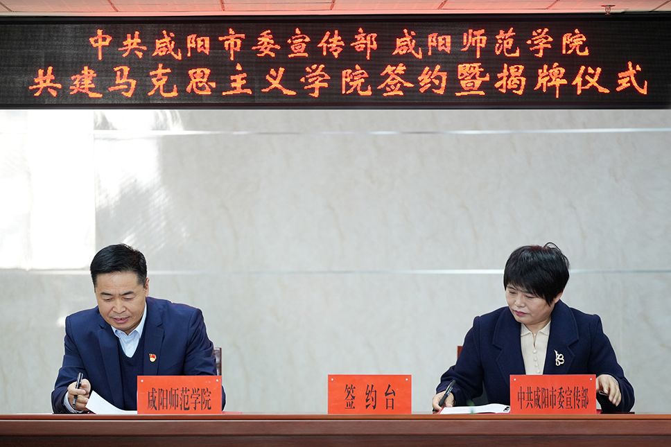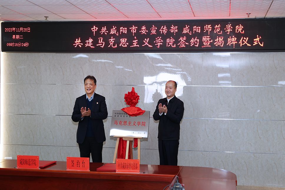中共咸阳市委常委、宣传部部长王永锋,校长王长顺共同为“共建马克思主义学院”揭牌;市委宣传部副部长李玉冰、校党委副书记袁也代表双方签署《共建马克思主义学院协议书》。共建仪式上,还为“咸阳市社科理论智库成员”颁发了聘书。