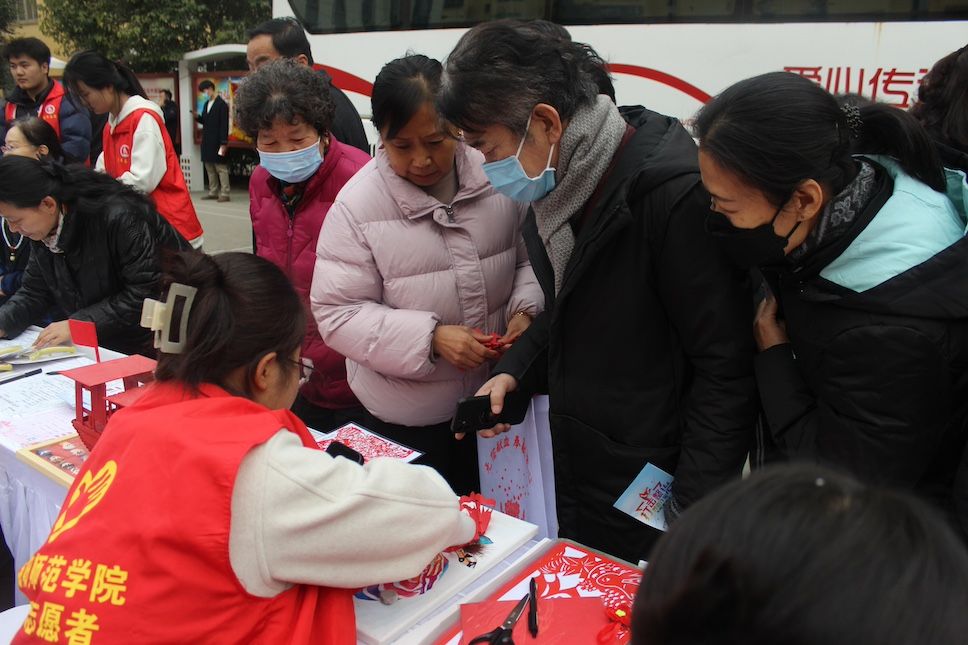 由教育科学学院团委派出的志愿服务队在新兴北路社区现场做手工、讲绘本,与小朋友共同制作扭扭棒花苞、小蘑菇、太阳花等作品。现场居民还在志愿者的示范帮助下,开展剪窗花活动。
