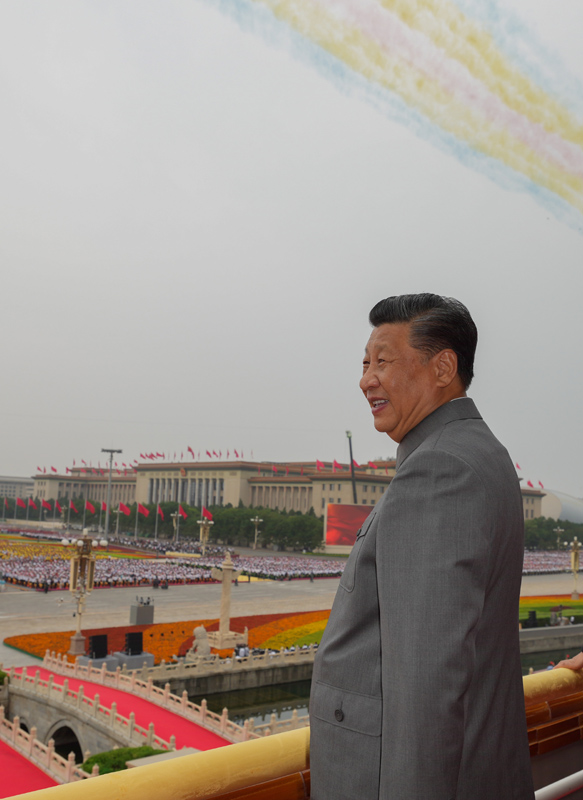 7月1日,庆祝中国共产党成立100周年大会在北京天安门广场隆重举行。中共中央总书记、国家主席、中央军委主席习近平发表重要讲话。这是习近平在天安门城楼上。