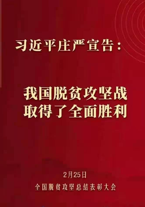 今天,我们隆重召开大会,庄严宣告,经过全党全国各族人民共同努力,在迎来中国共产党成立一百周年的重要时刻,我国脱贫攻坚战取得了全面胜利,现行标准下9899万农村贫困人口全部脱贫,832个贫困县全部摘帽,12.8万个贫困村全部出列,区域性整体贫困得到解决,完成了消除绝对贫困的艰巨任务,创造了又一个彪炳史册的人间奇迹!这是中国人民的伟大光荣,是中国共产党的伟大光荣,是中华民族的伟大光荣!