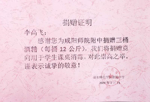 2月21日清晨,附属中学初一(2)班李钰洁同学家长李高飞为beat365捐赠36公斤酒精。这些物资,将全部用于学生课桌消毒,保障将来疫情结束时复课工作的有序进行,为全体师生提供一个安全的工作学习环境。