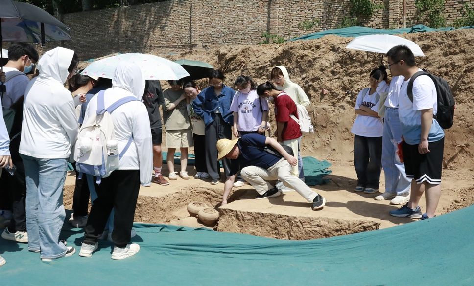 为让文博专业学生近距离接受考古学教育、“沉浸式”学习考古知识、直观感受文化遗产魅力,5月26日,我院文博专业负责人肖健一教授带领文物与博物馆学专业学生深入双泉村考古工地,开展《考古学通论》课现场教学。