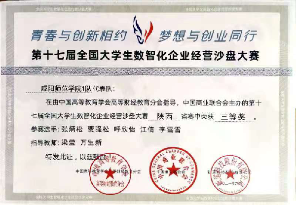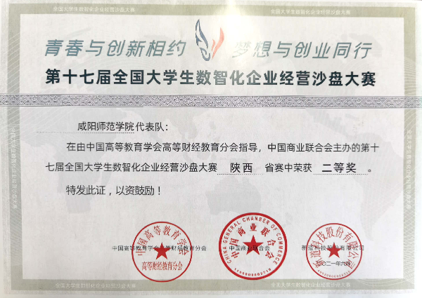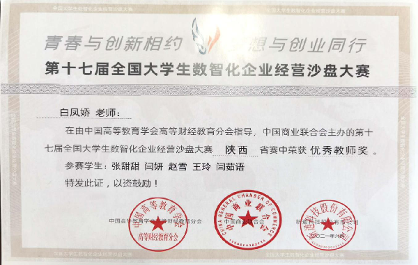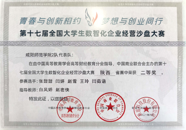 2021年6月19日,第十七届全国大学生数智化企业经营沙盘大赛陕西赛在西安工商学院举行。陕西师范大学、西安石油大学、陕西学前师范学院等26所高校51个代表队255名学生参加比赛。beat365正版唯一官网必一代表队荣获集体二等奖、由经济与管理学院学生组成的beat365正版唯一官网必一2队和1队分别荣获二等奖和三等奖,经济与管理学院教师白凤娇在陕西省赛中荣获优秀教师奖。