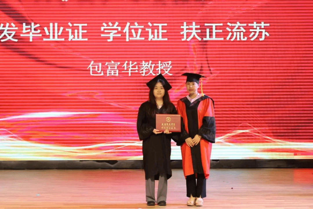 姚波教授、白凤娇教授、万生新教授、李玲教授、包富华教授为2024届毕业生拨穗正冠,颁发学位证书并合影留念。