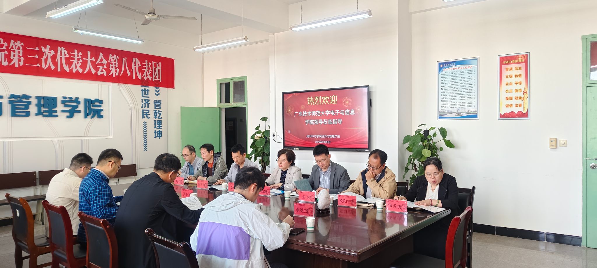 2024 年10月16日,广东技术师范大学电子与信息学院院长单纯教授带队一行四人莅临我院开展产教融合与师资队伍建设交流会。我院书记张龙、副院长孙媛媛、院长助理兼文化与旅游系主任李淼、财务管理系主任温文、社会工作与公共管理系主任解茹玉、经济与贸易系主任张畅、物流管理系副主任闫柏睿参加调研,孙媛媛主持会议。