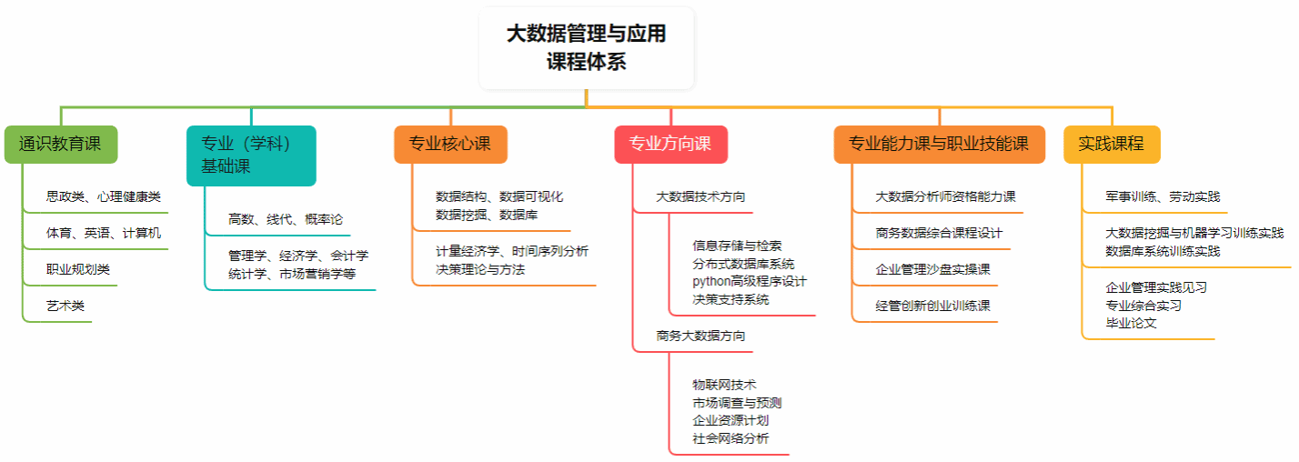 课程设计覆盖数据全生命周期管理,包括数据采集、存储、分析挖掘及商业决策支持等环节,形成“基础层(管理学/经济学)-技术层(数据库/数据分析)-实践层(数据可视化/决策实训)”的进阶培养路径。