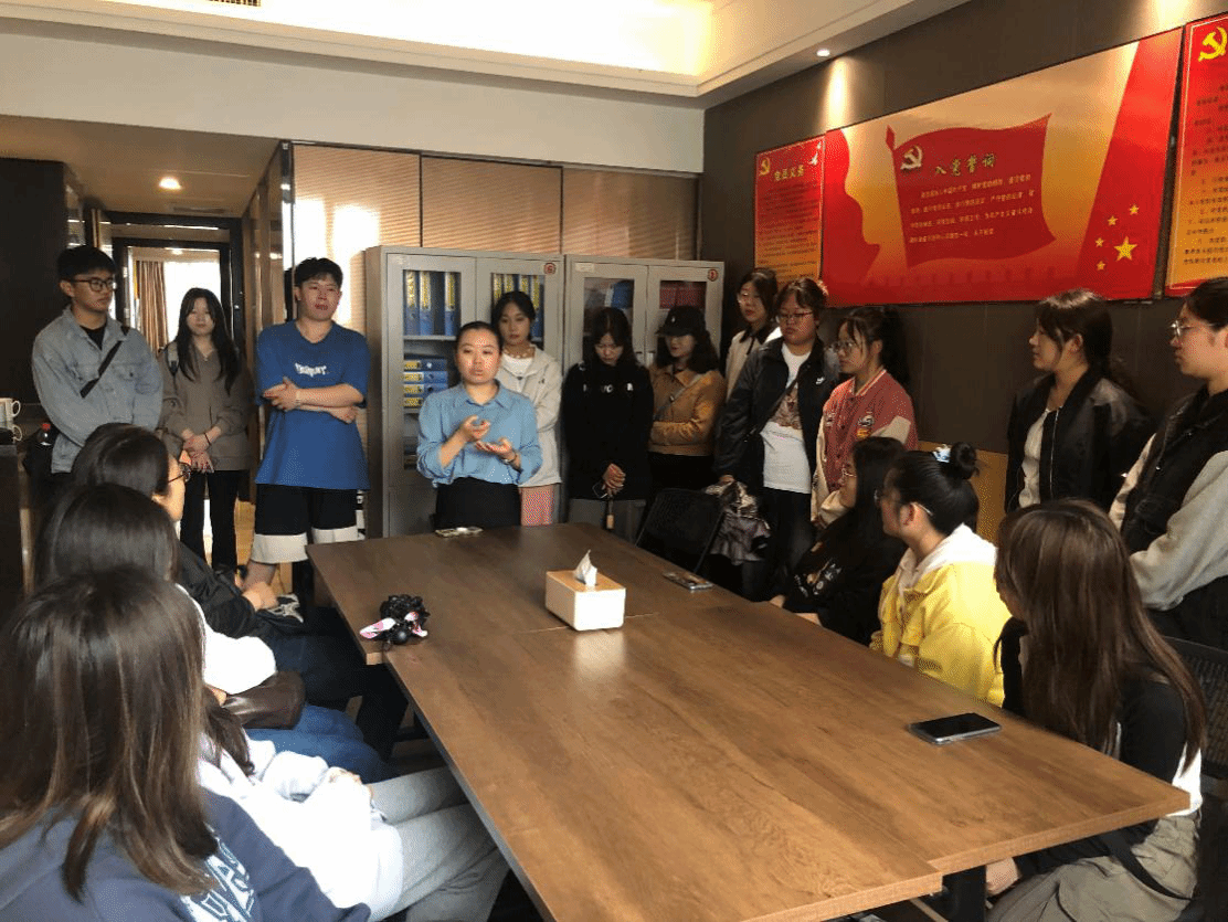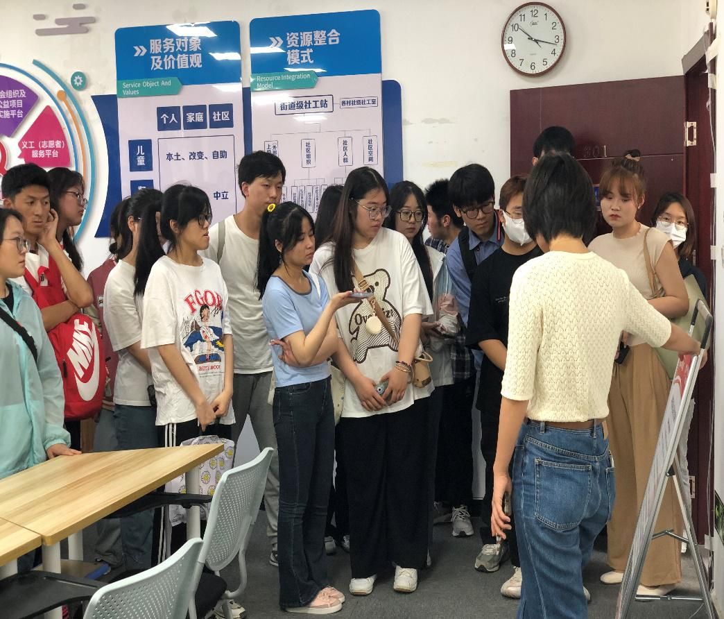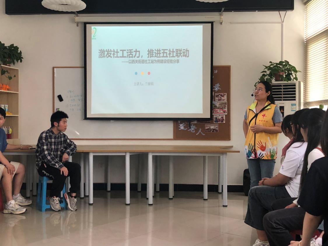 西关街道社工站负责人在向同学们讲解社会工作五社联动的具体内容和实际意义