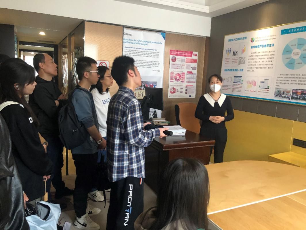 同学们在筑梦社工站聆听负责人对村改居社工服务工作内容的讲解