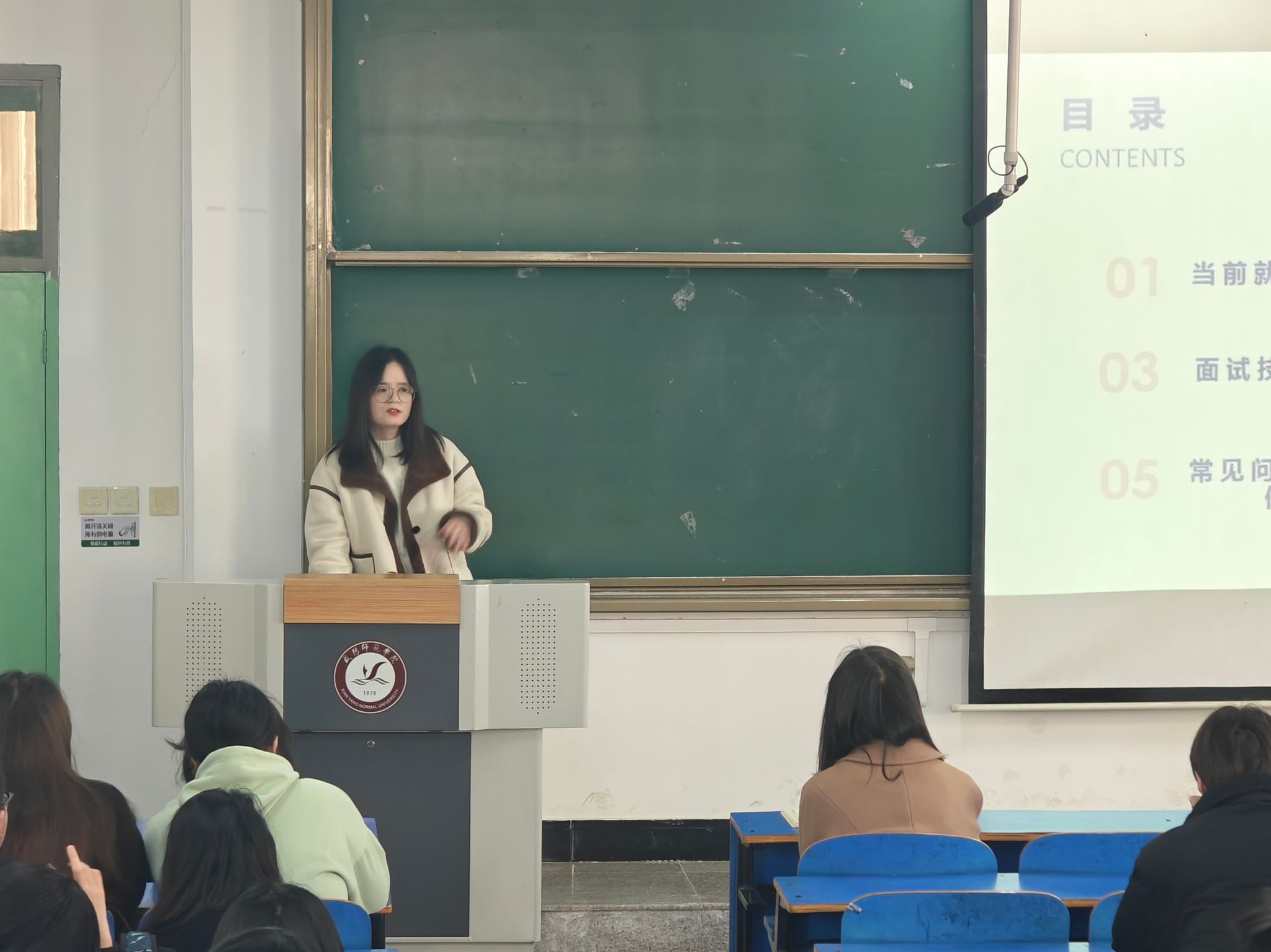 会上,陈萌立足当下就业大环境,深度剖析2025届毕业生面临的就业形势。她通过学校就业指导中心官网的招聘信息,到各大行业垂直招聘平台的精准推送,再到校友内推、企业官网直投等途径,为同学们分享了多元就业信息获取渠道。她围绕面试应答、面试技巧等关键点,从常见问题预演、肢体语言规范,到如何展现专业素养与团队协作能力,都给予指导。在就业安全教育环节,她以真实案例为引,提醒毕业生需警惕“高薪陷阱”“虚假招聘”等风险,从人身安全、财产安全、防范传销陷阱及信息甄别四大维度,传授识别与防范技巧,建议学生通过官方平台核实企业资质、签订规范劳动合同。