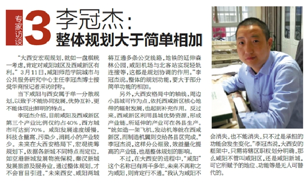 关注咸阳两会,聚焦社会热点。值咸阳两会召开之际,我院教师、城市与公共服务研究中心主任李冠杰博士,近日就“新格局下咸阳如何追赶超越?”,接受了《华商报》记者的采访(见2017-3-13《华商报》DD24版)。