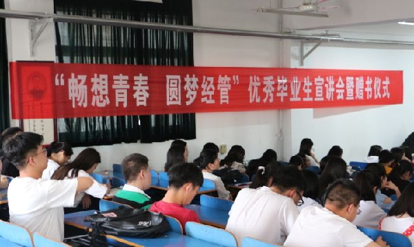 6月12日,我院召开“畅想青春,圆梦经管”优秀毕业生宣讲会暨赠书仪式。学院党委副书记赵丽、学工办主任李静、辅导员李亚峰、陈萌、王梅,刘雨、杨鑫、冯小军等8位优秀毕业生代表及大一、大三年级近300余人参与此次活动。