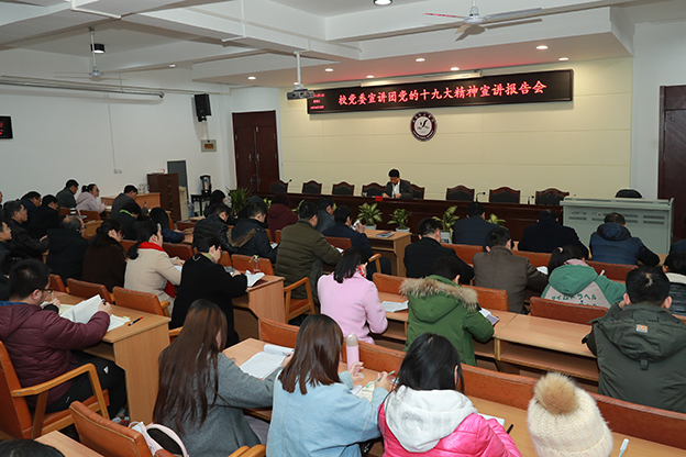 王书记重点从认真学习深刻领会党的十九大精神、准确把握贯彻落实党的十九大对教育工作提出的新要求新任务、持续扎实推进反腐倡廉建设等方面,全面深入地解读了党的十九大精神基本内涵和核心要义。他强调,全校各级党组织、党员干部、师生员工要不忘初心、牢记使命,紧密团结在以习近平同志为核心的党中央周围,把学习贯彻党的十九大精神与落实好立德树人根本任务、教学科研中心工作和改革发展等紧密结合,切实在学懂弄通做事上下功夫,把智慧和力量凝聚到党的十九大提出的教育事业发展目标上来,扎实推进学校内涵发展,着力提升办学层次,努力提高人才培养质量,落实办好人民满意教育的要求,奋力谱写新时代学校建设发展新篇章。
