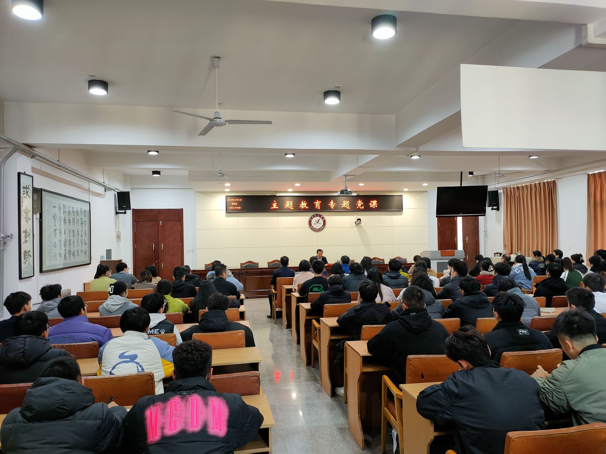 化学与化工学院、体育学院领导班子和师生党员,机关第四党支部全体党员100余人参加了党课学习。