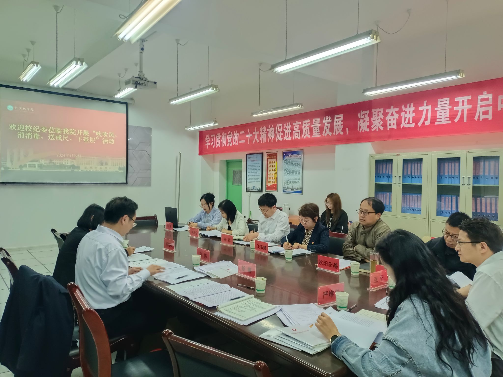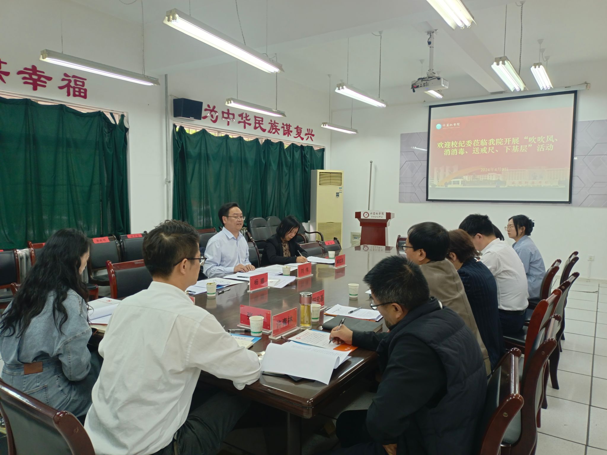 4月9日,校纪委与计算机学院党委开展“吹吹风、消消毒、送戒尺、下基层”党风廉政教育学习活动。学院党委书记王革慧主持活动。