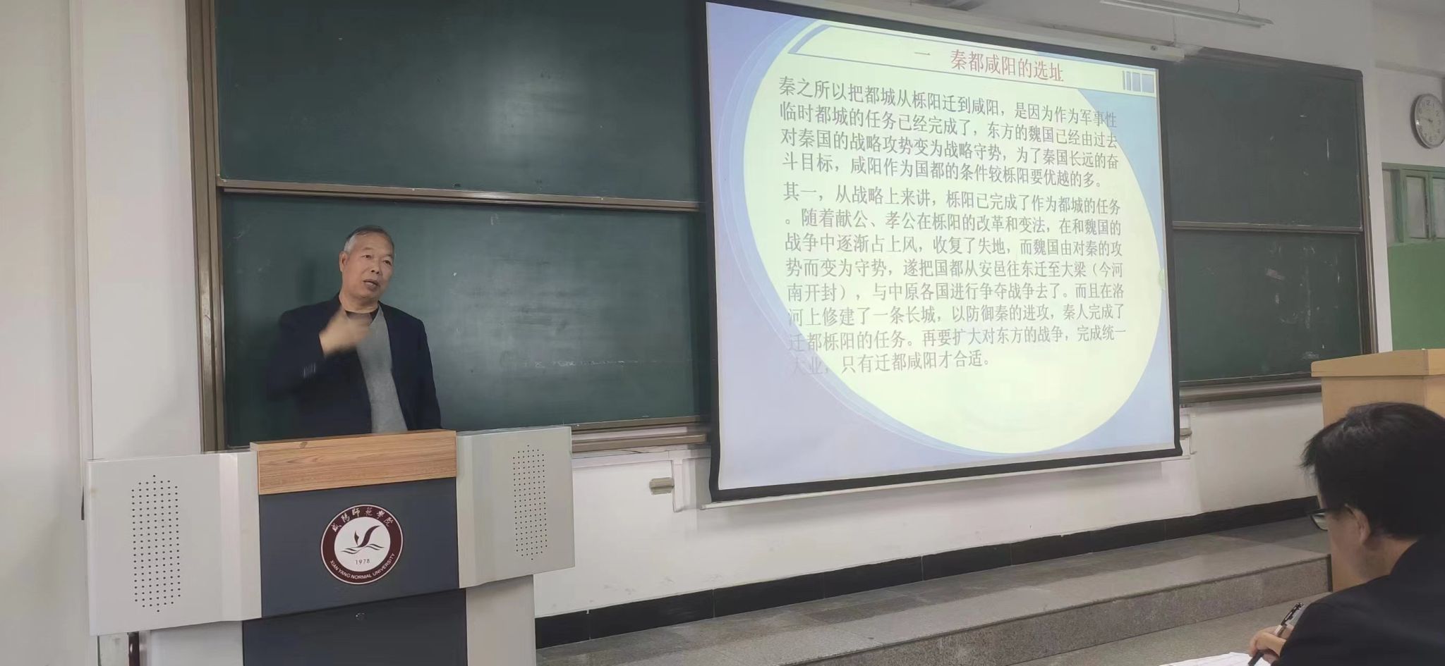 2023年4月14日下午,历史文化学院科技之春论坛暨校庆45周年学术大讲堂系列活动在1-725教室举行。应我院邀请,西北大学文化遗产学院徐卫民教授作了题为“秦都咸阳的规划设计理念”的学术报告。报告会由我院王永飞副院长主持,我院老师、学生近200余人参加了讲座。