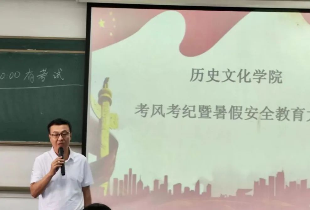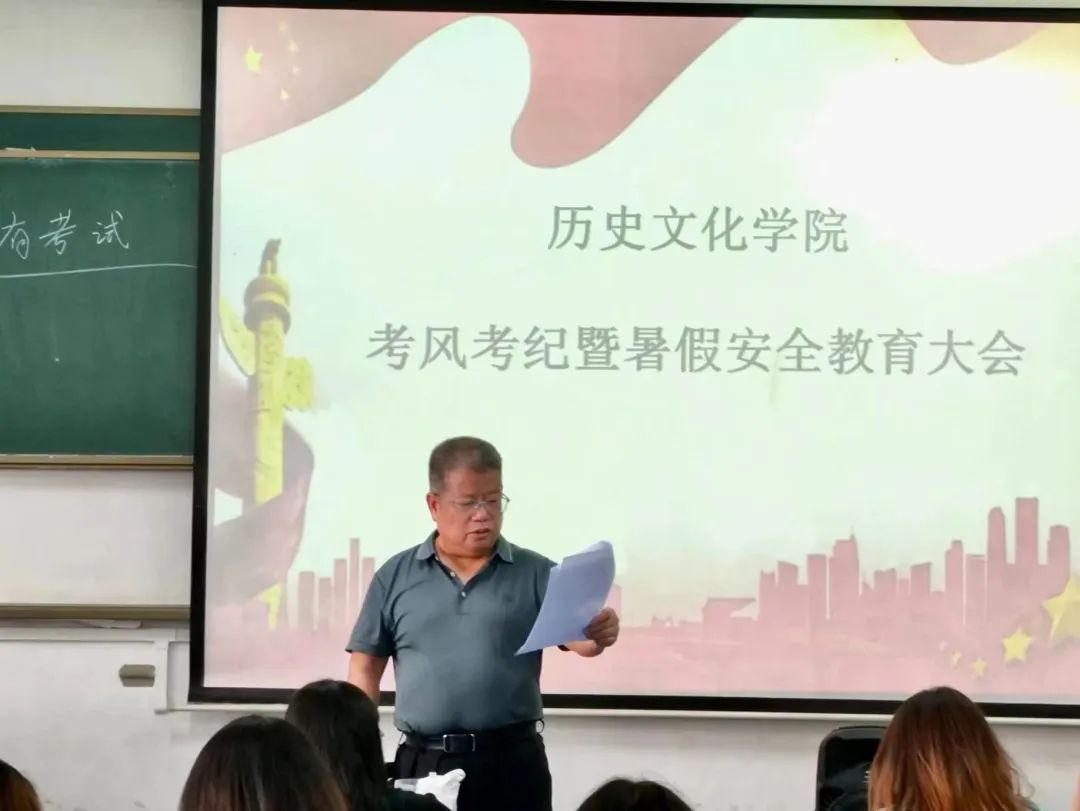 6月26日下午,我院在一号教学楼725教师召开了历史文化学院2022-2023年第二学期期末考试考风考纪暨暑假安全教育大会,大会由辅导员王保全主持,副院长王永飞、办公室主任李鑫以及我院大一、大二全体学生参加。