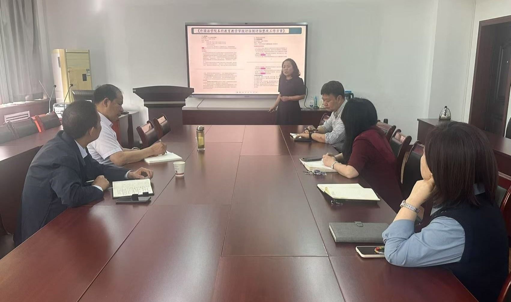 在汇报会上,外国语学院教学副院长赵崇俊就审核评估工作进展及阶段性成果进行详实汇报。随后院长肖春艳从学院发展概况、规划思路、举措与成效、特色亮点及改进方向等维度,系统进行了学院本科教育教学工作汇报。
