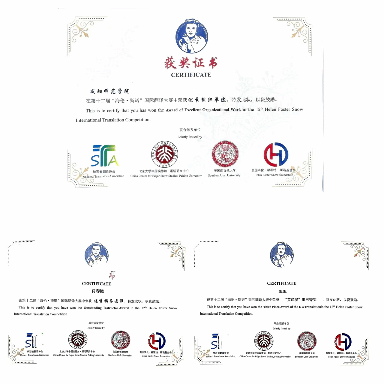 同期举行的第十二届海伦·斯诺国际翻译大赛传来捷报。经过多轮评审,我院凭借有序的组织动员,荣获“最佳组织奖”,肖春艳院长被授予“最佳指导教师奖”,王玉老师获得英译汉组三等奖,张馨颖同学获得优秀奖,彰显了我院在外语翻译人才培养与学科建设上的雄厚实力。