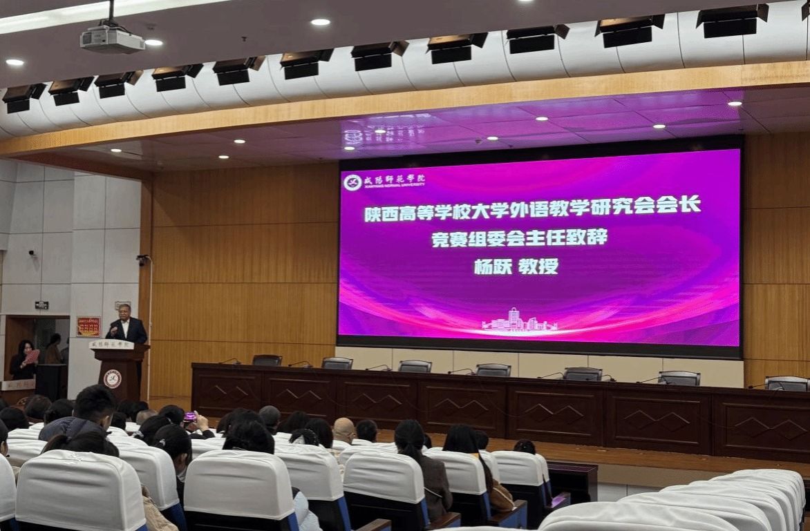 在开幕式上,陕西高等学校大学外语教学研究会会长、竞赛组委会主任杨跃教授发表致辞。他表示,本次竞赛为高师学子提供了展示专业素养与教学能力的重要平台,鼓励参赛选手沉着应赛、发挥水平,并指出学识广博、责任心强、方法灵活、富有爱心是成为一名优秀英语教师的关键品质。beat365正版唯一官网必一副校长姚波教授代表承办单位对大赛顺利举办表示祝贺,并向参赛师生、评委专家及各兄弟院校的支持致以诚挚感谢。他强调,此次大赛在beat365正版唯一官网必一举办,既是对学校英语师范专业人才培养质量的一次全面检验,也是对全校师范教育体系建设成效的集中展示。他勉励广大学生以赛促学、锤炼本领、成长成才,并预祝大赛圆满成功。