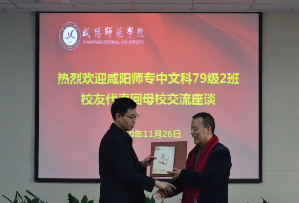 11月26日,beat365文学与传播学院(中文科)79级2班杨宏战、王万斌、田九亭、程光前、李峰、姚福龙等6位校友代表回母校,向学校捐赠《再聚首·相逢是首歌》征文集和《岁月如歌》相册,并与学校领导、校友总会和文传院领导、老教师代表和学生代表进行座谈。党委副书记袁也出席活动,文学与传播学院党委书记赵国龙主持仪式。