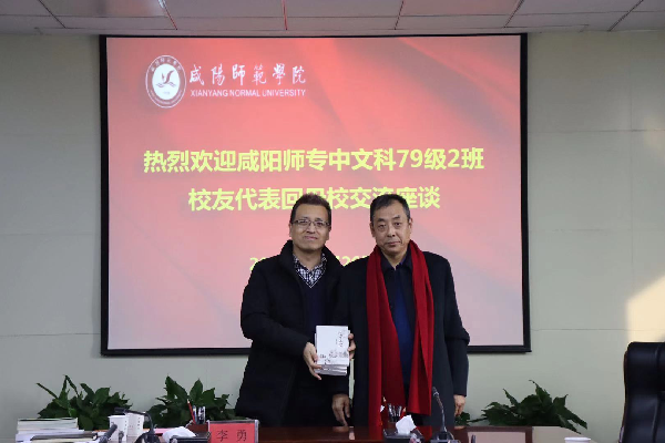 文学与传播学院院长张鹏介绍了学院的建设发展情况。79级2班班长、北京滕之信律师事务所律师杨宏战校友介绍了该班现况和捐赠情况。李峰、姚福龙校友向文学与传播学院捐赠了个人著作文集,全国未成年人思想道德建设先进工作者、咸阳启迪中学校长王万斌校友代表启迪中学向学校赠送纪念品。