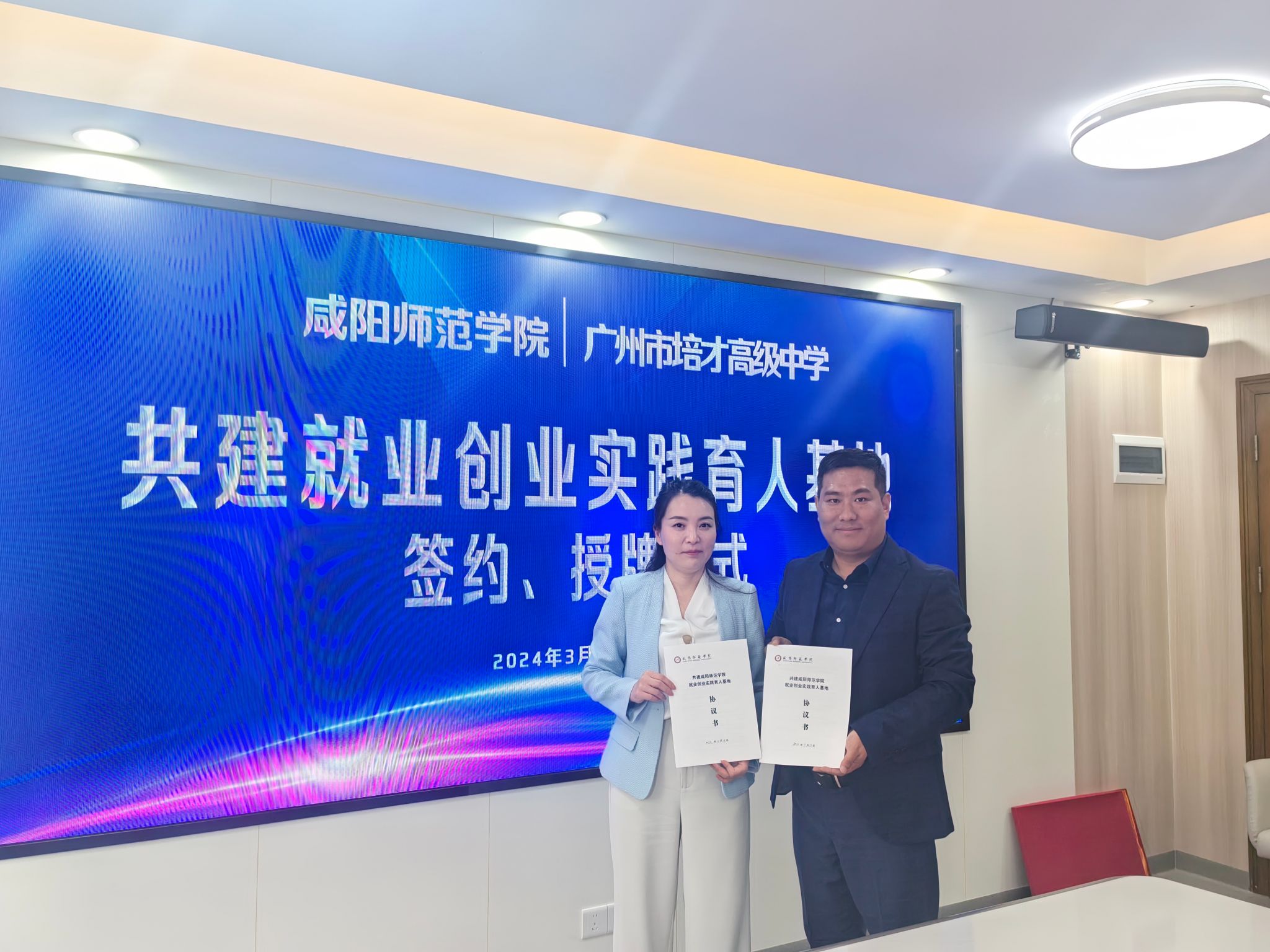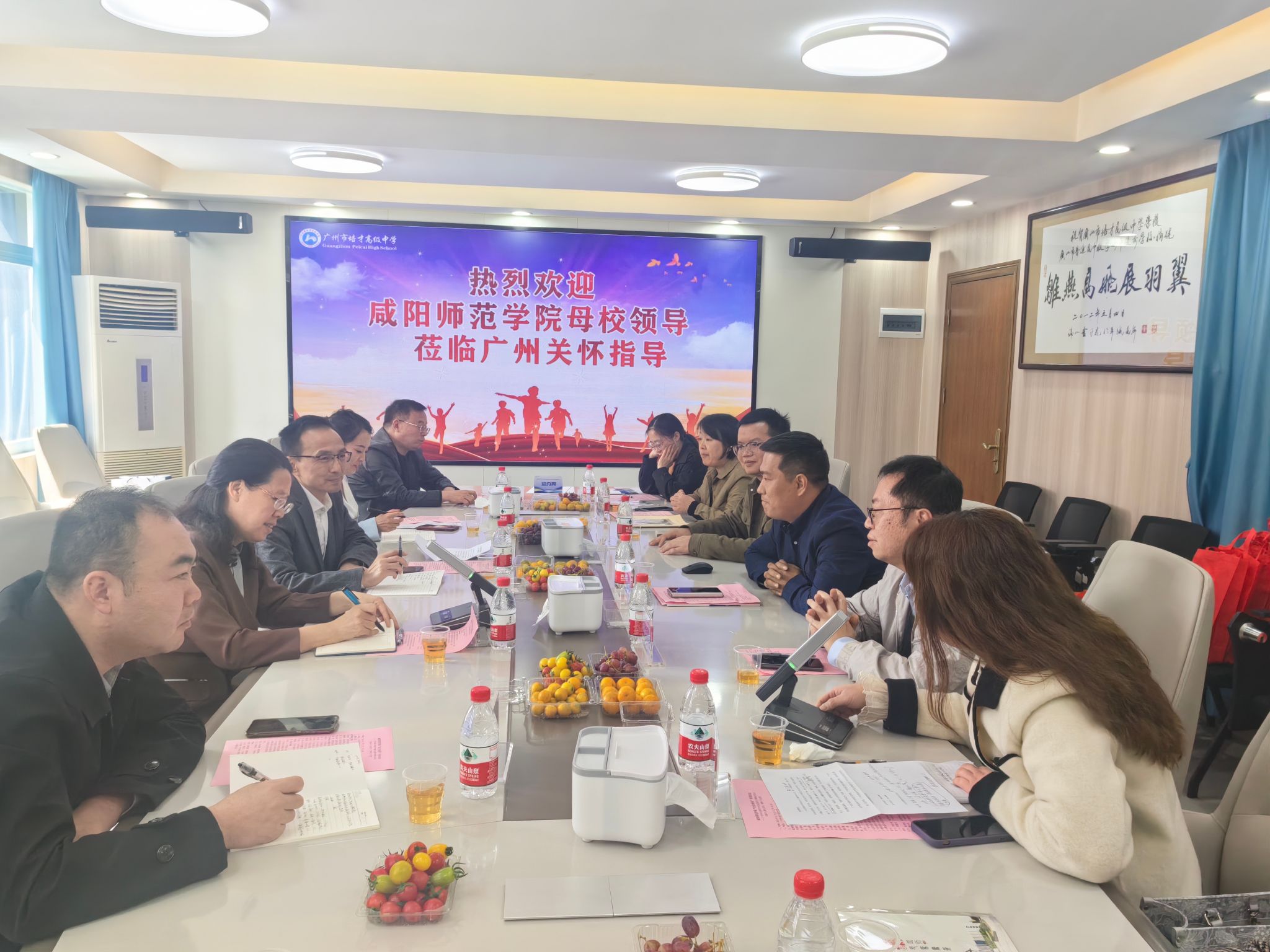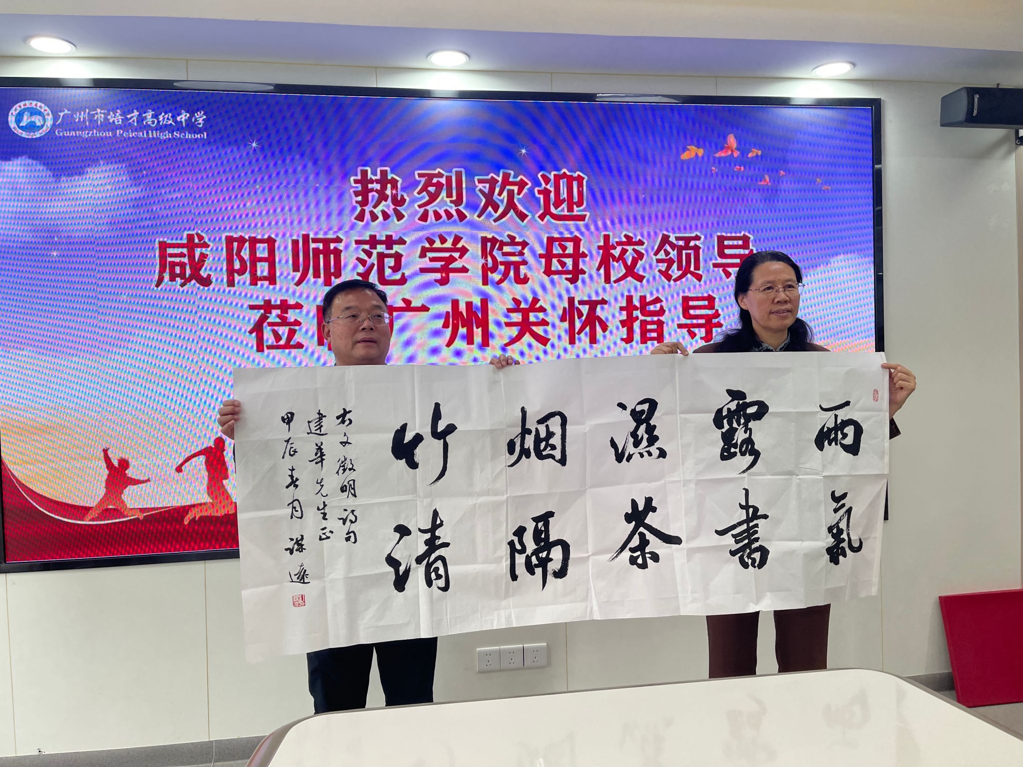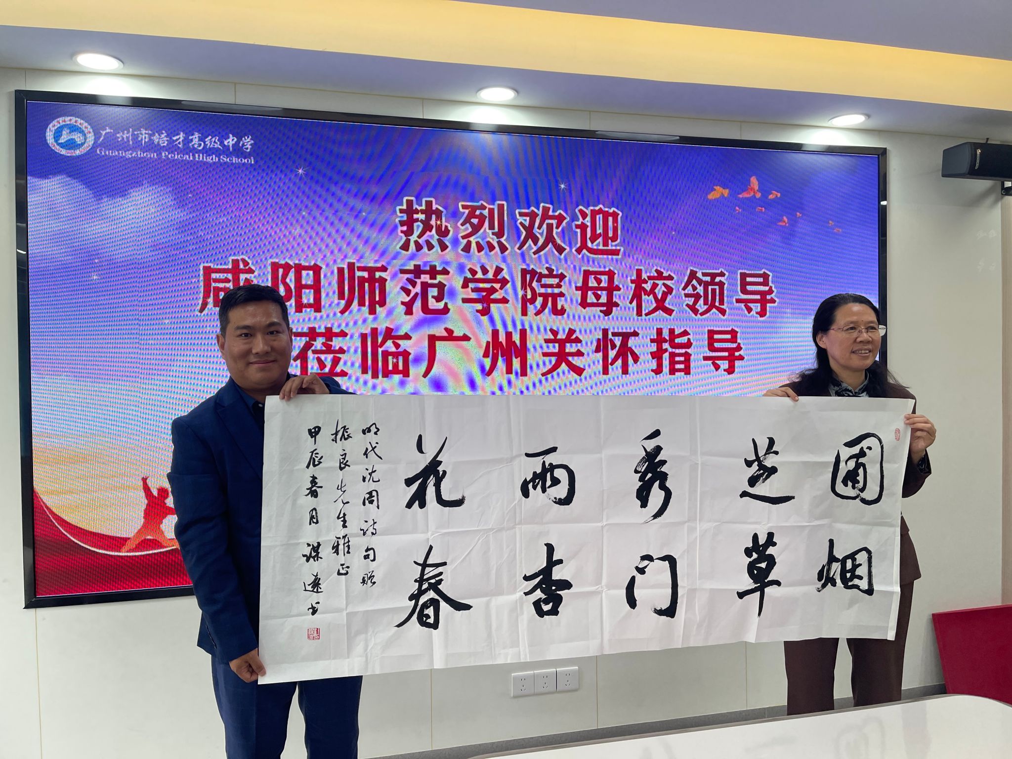 3月13日上午,在广州市培才高级中学,beat3652006届数学系校友、培才高级中学党支部副书记、副校长黄振良欢迎周群英一行前来广州交流调研,黄振良介绍了广州市培才高级中学的发展历程、教育教学成果、教师招聘等基本情况;回忆了当年在母校学习生活的难忘经历和母校恩师的悉心教导,以及受厚德博学校训浸润养成的踏实肯干、认真负责、爱校爱生的优秀品德。黄振良表示母校一定是人生最美好的回忆之一,是人生翱翔的起点,是人生路上的明灯。母校老师辛勤耕耘、无私奉献,教授学生知识、培养能力和锤炼品格,为每一位学生的青春之路鼓足干劲、指明方向,感谢母校和老师的教育培养。希望和母校在大学生实习实训、人才招聘、就业创业及科研项目等领域深度合作,回馈母校教育培养,共建共享共赢。双方代表签订了《beat365正版唯一官网必一共建就业创业实践育人基地协议书》。周群英、黄振良共同为“就业创业实践育人基地”揭牌。并为校友代表杜建华、黄振良赠送了书法作品。