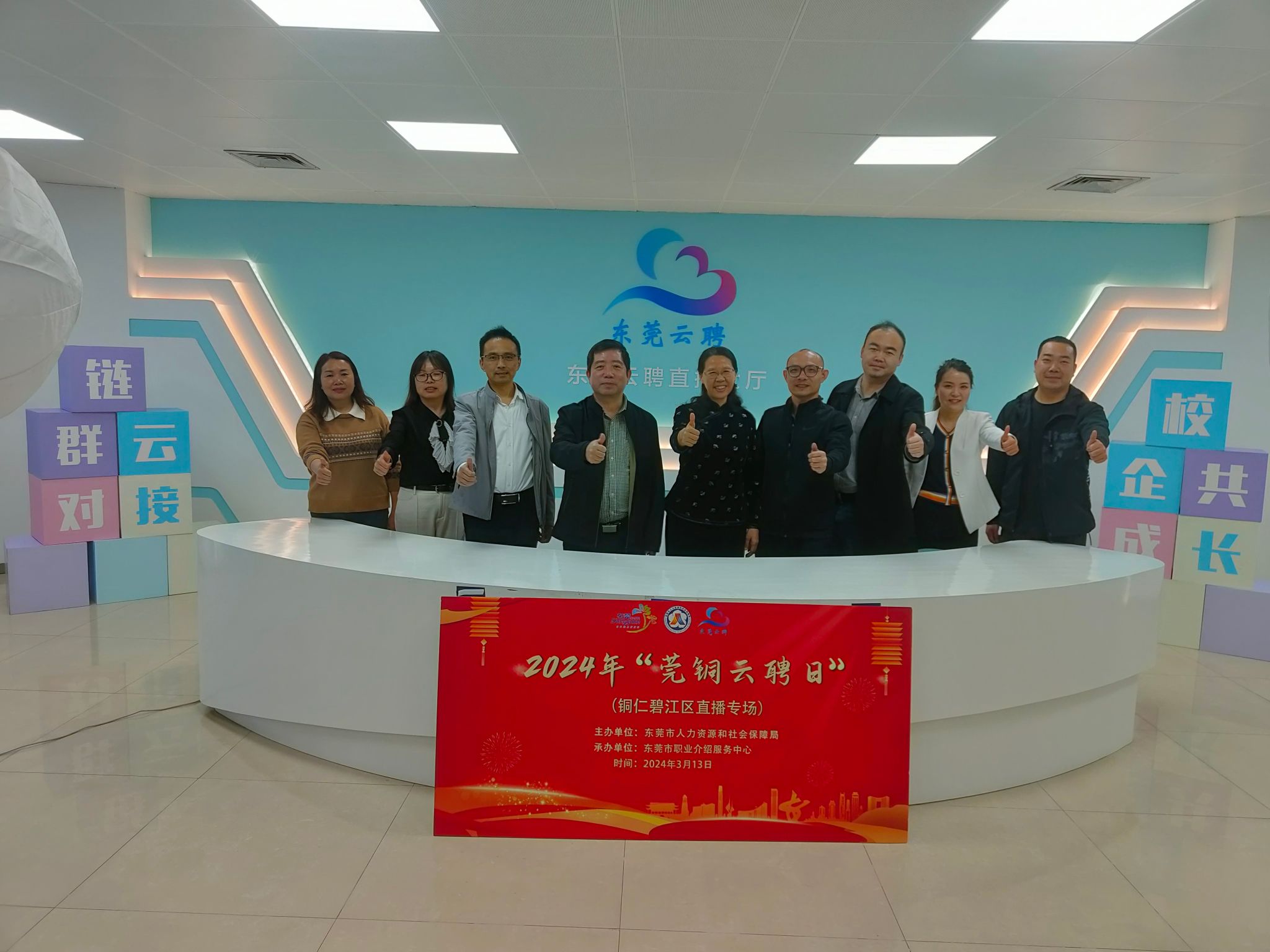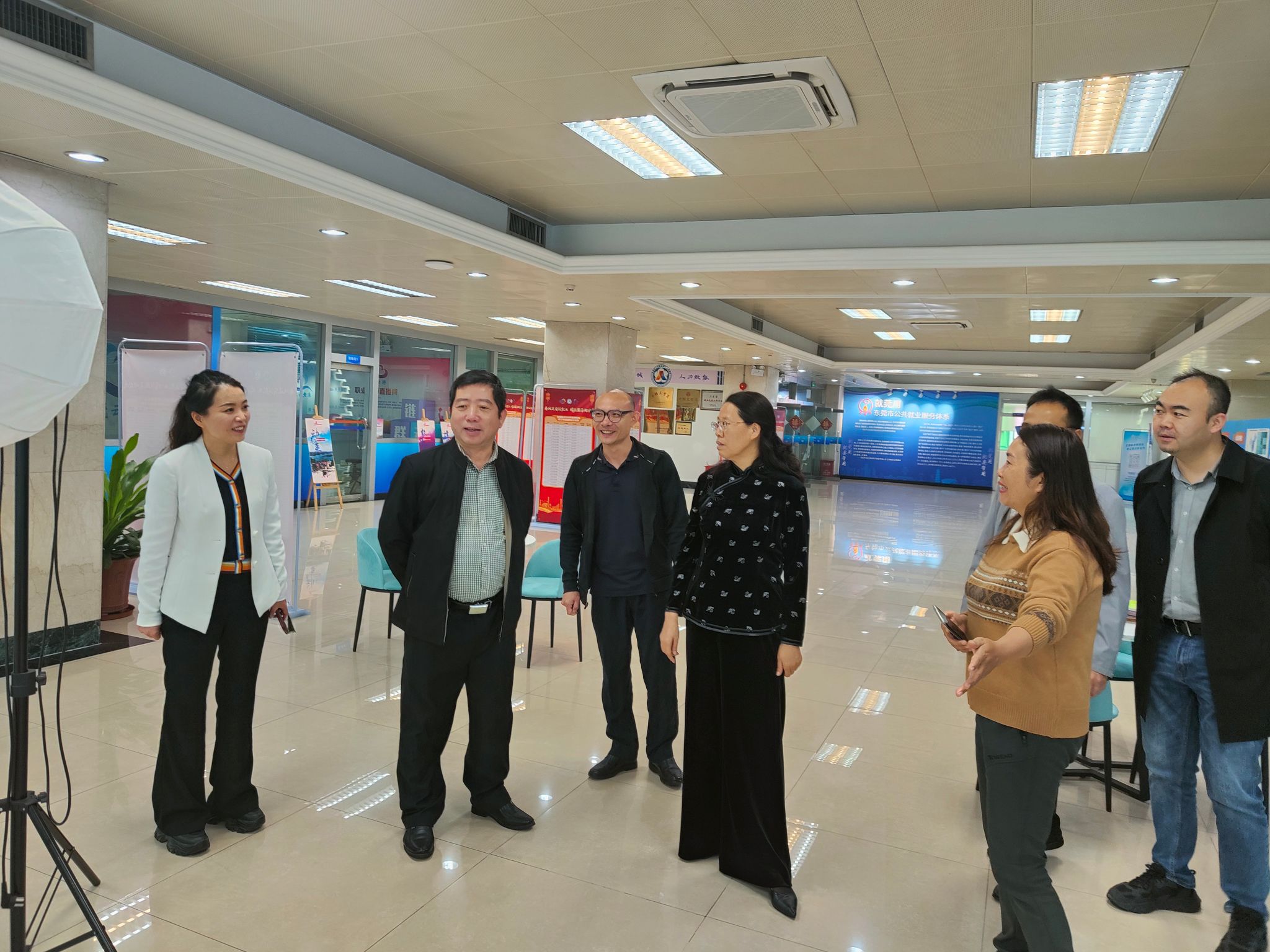 3月15日上午,周群英一行前往东莞市人力资源和社会保障局访企拓岗、交流调研。该局四级调研员侯首文、东莞市职业介绍服务中心副主任赖润坤、主任职员王君梅参加交流座谈。双方围绕东莞人才招聘需求、就“莞”用工厂招聘等就业新举措、校企校地合作、共建就业创业实习实践育人基地等方面展开深度交流。并参观了“东莞云聘”直播大厅,详细了解了“就莞用--东莞市公共就业服务体系”和云聘直播平台的操作流程及招聘成效。双方共同观看了“东莞城市宣传片”和“beat365正版唯一官网必一宣传片”。会后周群英一行还会见了东莞市职业介绍服务中心主任叶桂兴。