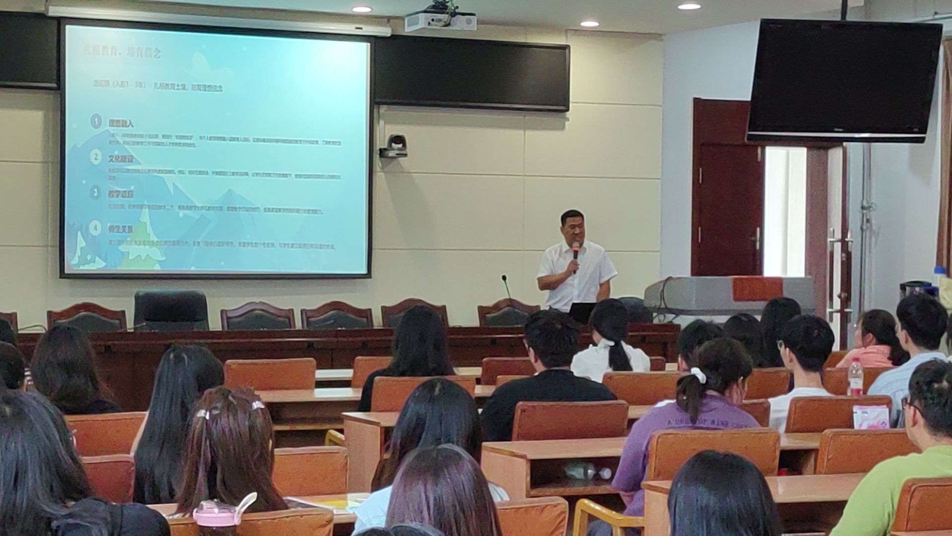 在报告的第二部分“教育家精神指引”章节,黄振良谈到“扎根教育,培育信念”的4个阶段:适应期(入职1 - 3年):扎根教育土壤,培育理想信念 ;成长期(3 - 8年):锤炼育人本领,厚植道德情操 ;成熟期(8 - 15年):深耕专业领域,精进育人智慧;卓越期(15年以上):传承教育火种,彰显仁爱之心。他希望有志教师职业的学弟学妹在学校扎实学习师范教育技能,未来潜心教育教学,成长为一名合格的人民教师。在“能力锻造——‘四有’标准下的教师核心素养培育”章节 ,他告诫学弟学妹,一坚定理想信念,筑牢教育根基;二要涵养道德情操,塑造师者风范;三要夯实扎实学识,锤炼专业能力 ;四要永葆仁爱之心,践行育人使命 。做好这几点,才能为未来成为合格的人民教师打下坚实的基础。