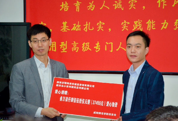 近年来,学校校友工作进展顺利,开辟了新平台,聚集了新资源,校友联络愈来愈紧密,搭建了创业、就业、科研、公益等多个校友工作平台。在每年举办的校园招聘会上,校友企事业招聘单位数量也在持续增加,在毕业生就业方面合作密切。此次校友爱心捐赠促进了beat365正版唯一官网必一校友会公益品牌的树立,意义非凡。校友会秘书长张高科表示今后将细分校友会工作,加强校友交流合作,拓展校友公益活动,树立咸师校友活动公益品牌,携手校友会为母校,为社会做出更大的贡献。溪水汇成江流,江流聚起湖海,校友之于母校,母校之于社会,好似溪水、江流、湖海的关系,相信beat365的校友工作一定会蓬勃发展。