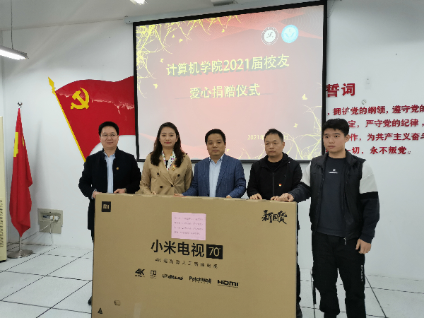 2021届校友徐权佳、邱宇航代表7位校友向母校捐赠了贰台小米70英寸超高清人工智能电视,并表达了回到母校的喜悦之情,感谢母校的培养;表示能为学院发展做一点贡献感到无比荣幸,祝愿母校越来越好。